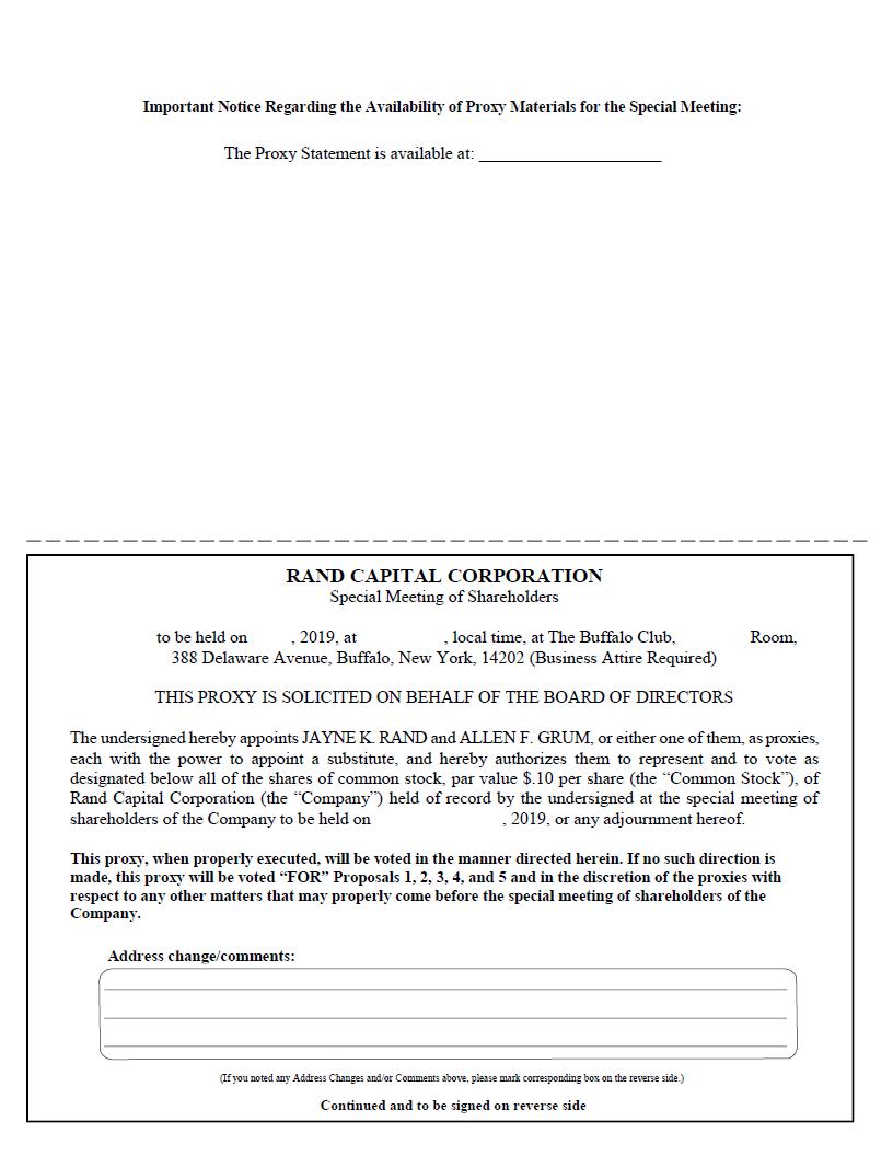 You are cordially invited to attend the special meeting of the shareholders of Rand Capital Corporation (the “Company”) to be held on , 2019, at , local time, at The Buffalo Club, Room, 388 Delaware Avenue, Buffalo, New York, 14202 (Business Attire Required). Only shareholders of record at the close of business on , 2019 are entitled to notice of, and to vote at, the special meeting, or any adjournment or postponement thereof. You will find the details of the business to be conducted at the special meeting in the accompanying Notice of Special Meeting of Shareholders (“Notice”) and proxy statement.