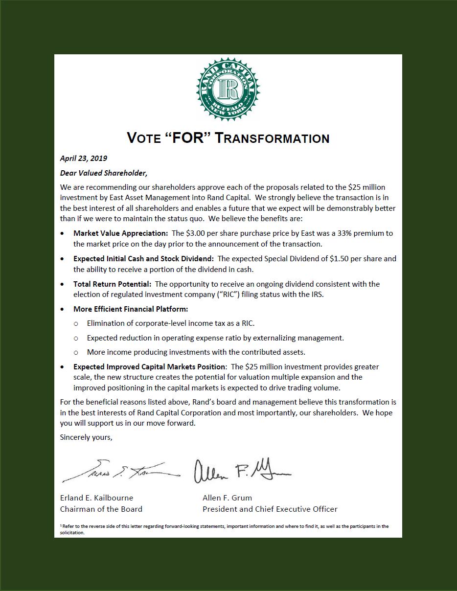 This letter contains “forward-looking statements” within the meaning of Section 27A of the Securities Act of 1933, as amended, and Section 21E of the Securities Exchange Act of 1934, as amended. All statements, other than historical facts, including but not limited to statements regarding the expected timing of the closing of the proposed transactions; the ability of the parties to complete the proposed transactions considering the various closing conditions, including receipt of necessary shareholder approvals and approval from the U.S. Small Business Administration (“SBA”); the intention of Rand Capital Corporation (“Rand Capital”, “Rand” or the “Company”) and Rand Capital SBIC, Inc. (“Rand SBIC”) to elect to be taxed as a regulated investment companies for U.S. federal tax purposes; the intention to declare and pay a special cash and stock dividend after the closing of the proposed transactions; the intention to pay a regular cash dividend after the completion of the proposed transactions; the expected benefits of the proposed transactions such as a lower expense-to-asset ratio for Rand Capital, increased net investment income, availability of additional resources, expanded access to and sourcing platform for new investments and streamlining of operations under the external management structure; the business strategy of originating additional income producing investments; the competitive ability and position of Rand Capital following completion of the proposed transactions; and any assumptions underlying any of the foregoing, are forward-looking statements. Forward-looking statements concern future circumstances and results and other statements that are not historical facts and are sometimes identified by the words “may,” “will,” “should,” “potential,” “intend,” “expect,” “endeavor,” “seek,” “anticipate,” “estimate,” “overestimate,” “underestimate,” “believe,” “could,” “project,” “predict,” “continue,” “target” or other similar words or expressions. Should one or more of these risks or uncertainties materialize, or should underlying assumptions prove to be incorrect, actual results may vary materially from those indicated or anticipated by such forward-looking statements. The inclusion of such statements should not be regarded as a representation that such plans, estimates or expectations will be achieved. Important factors that could cause actual results to differ materially from such plans, estimates or expectations include, among others, (1) that one or more closing conditions to the stock purchase may not be satisfied or waived, on a timely basis or otherwise, including that the SBA may not approve the proposed transactions or that the required approvals by the shareholders of Rand Capital may not be obtained; (2) the risk that the proposed transactions may not be completed in the time frame expected by parties, or at all; (3) the risk that Rand Capital and/or Rand SBIC may be unable to fulfill the conditions required in order to elect to be treated as a regulated investment company for U.S. tax purposes; (4) uncertainty of the expected financial performance of Rand Capital following completion of the proposed transactions; (5) failure to realize the anticipated benefits of the proposed transactions, including as a result of delay in completing the proposed transactions; (6) the risk that the board of directors of Rand Capital is unable or unwilling to declare and pay the special cash and stock dividend or pay quarterly dividends on a going forward basis; (7) the occurrence of any event that could give rise to termination of the stock purchase agreement; (8) the risk that shareholder litigation in connection with the proposed transactions may affect the timing or occurrence of the contemplated transactions or result in significant costs of defense, indemnification and liability; (9) evolving legal, regulatory and tax regimes; (10) changes in general economic and/or industry specific conditions; and (11) other risk factors as detailed from time to time in Rand Capital’s reports filed with the Securities and Exchange Commission (“SEC”), including Rand Capital’s annual report on Form 10-K for the year ended December 31, 2018, later filed quarterly reports on Form 10-Q, the definitive proxy statement for the proposed transactions and other documents filed with the SEC. Consequently, such forward-looking statements should be regarded as Rand Capital’s current plans, estimates and beliefs. Except as required by applicable law, Rand Capital assumes no obligation to update the forward-looking information contained in this presentation.