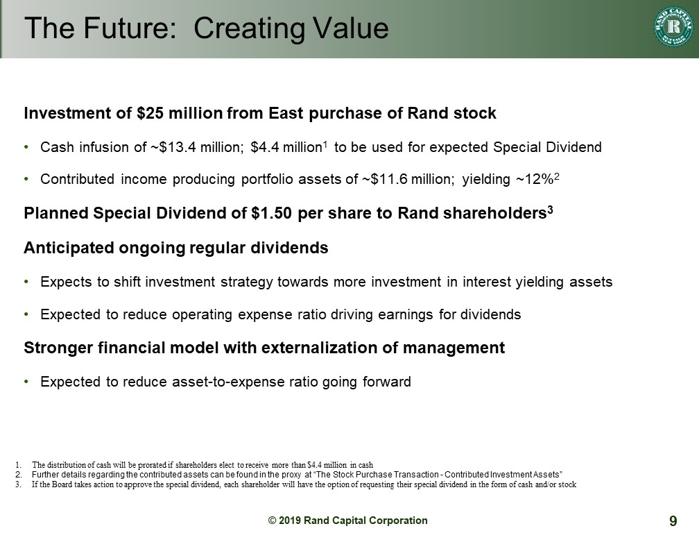 Another benefit from the strategic investment is that we will receive new portfolio investments having a fair value of $11.6 million. Rand management and the board evaluated the assets using processes we use for our own portfolio to come to an agreed fair value. These assets are income producing with a current interest rate of ~12%. This is consistent with our current portfolio. For example, eHealth had an interest rate of 13%. The idea that we were forced to accept whatever loans offered by East without our approval is incorrect. I should note that when we close the deal, the fair value of the assets is agreed upon and any variation to the value from our current assessment is an adjustment to the cash, positive or negative.