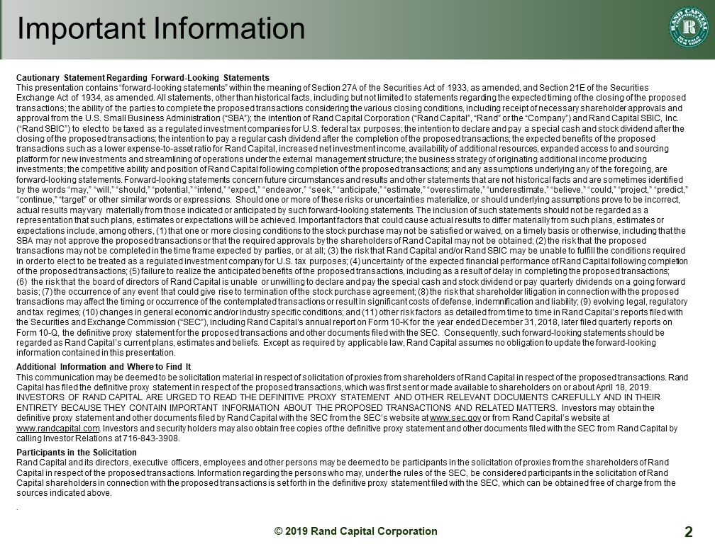 This communication may be deemed to be solicitation material in respect of solicitation of proxies from shareholders of Rand Capital in respect of the proposed transactions. Rand Capital has filed the definitive proxy statement in respect of the proposed transactions, which was first sent or made available to shareholders on or about April 18, 2019. INVESTORS OF RAND CAPITAL ARE URGED TO READ THE DEFINITIVE PROXY STATEMENT AND OTHER RELEVANT DOCUMENTS CAREFULLY AND IN THEIR ENTIRETY BECAUSE THEY CONTAIN IMPORTANT INFORMATION ABOUT THE PROPOSED TRANSACTIONS AND RELATED MATTERS. Investors may obtain the definitive proxy statement and other documents filed by Rand Capital with the SEC from the SEC’s website at www.sec.gov or from Rand Capital’s website at www.randcapital.com. Investors and security holders may also obtain free copies of the definitive proxy statement and other documents filed with the SEC from Rand Capital by calling Investor Relations at 716-843-3908.
