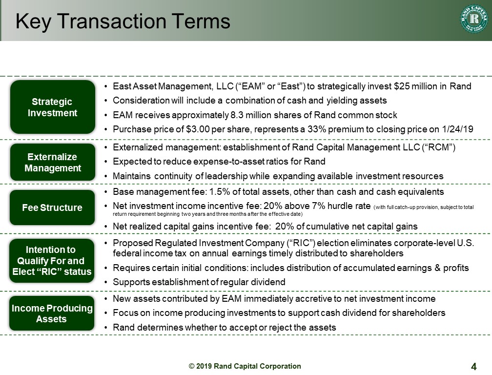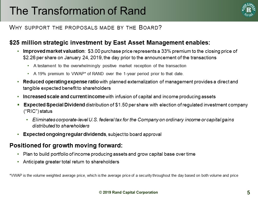 Turning to Slide 4, I want to take this opportunity to provide a review of the potential for creating value for our shareholders through the transformation of Rand. The proposed $25 million dollar strategic investment by East Asset management can make this possible. They are purchasing 8.3 million shares at a price of 3 dollars per share. That price is a 33% premium to our closing price the day prior to the announcement.