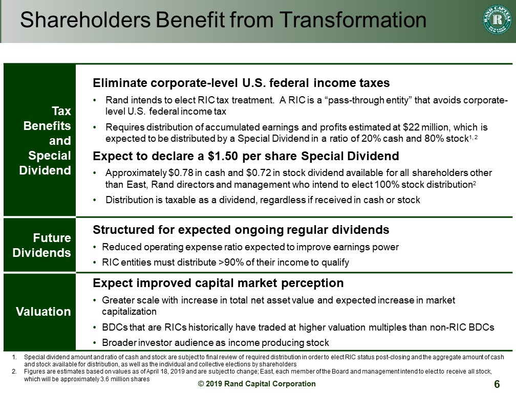 To elect RIC status we have to distribute our accumulated earnings and profits since inception that we estimate is about $22 million dollars. We plan to make this distribution, enabled by a portion of East’s investment, as a special dividend of approximately $1.50 per share. To maintain this advantageous tax status, we will be required to distribute greater than 90 percent of our net investment income in dividends to shareholders, subject to board approval.