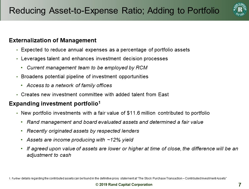Another benefit from the strategic investment is that we will receive new portfolio investments having a fair value of $11.6 million. Rand management and the board evaluated the assets using processes we use for our own portfolio to come to an agreed fair value. These assets are income producing with a current interest rate of ~12%. This is consistent with our current portfolio. For example, eHealth had an interest rate of 13%. The idea that we were forced to accept whatever loans offered by East without our approval is incorrect. I should note that when we close the deal, the fair value of the assets is agreed upon and any variation to the value from our current assessment is an adjustment to the cash, positive or negative.