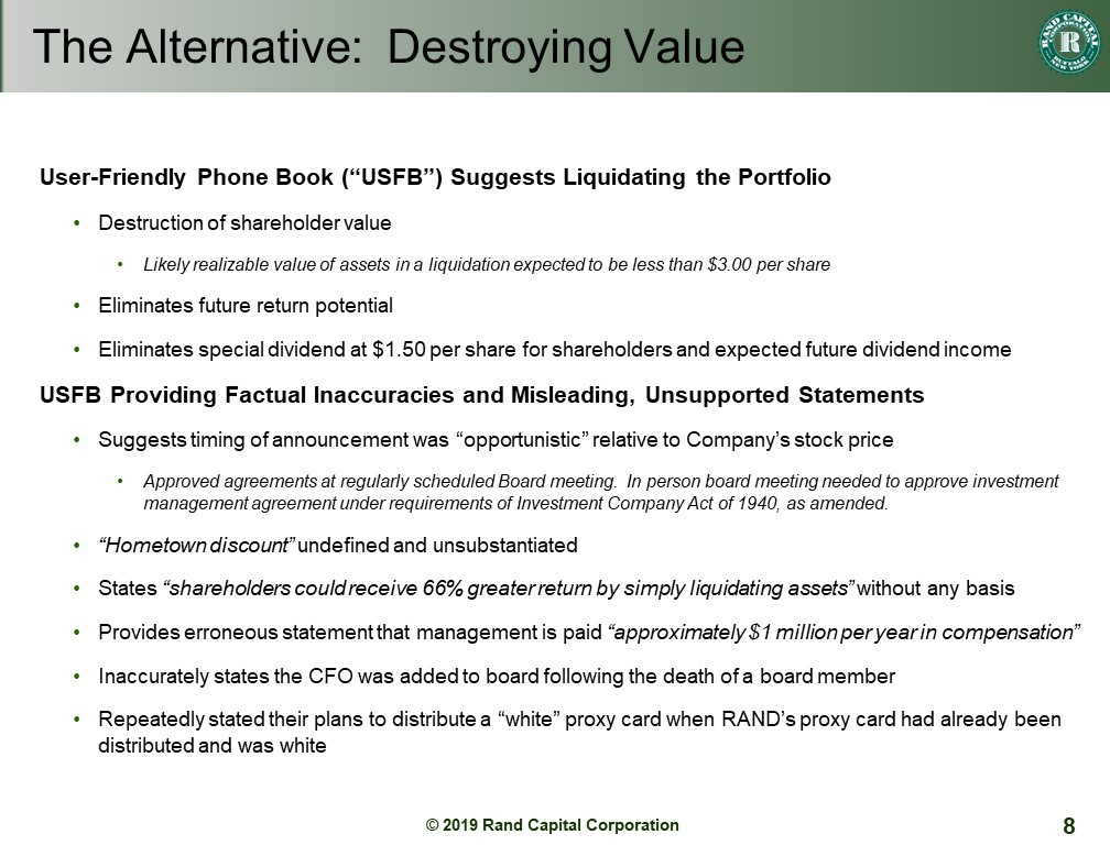 On May 2, 2019, Rand Capital Corporation used the following presentation as a reference during its earnings conference call for the first quarter of 2019 and posted the following presentation to its website: