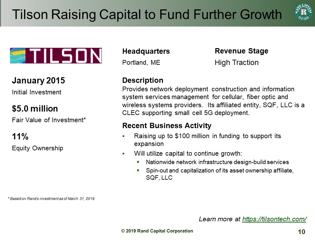 | ● | Tilson Technology Management, Inc., which has been recognized for eight consecutive years on the Inc. 5000 list of fastest growing companies, provides network deployment and information system professional services to telecom, construction, utility and government clients. Tilson recently announced that it raised up to $100 million in funding commitment to support the expansion of its nationwide network of infrastructure design-build services and to enable the spin-out and capitalization of its asset ownership affiliate, SQF, LLC. SQF maintains authority to own and develop telecommunications assets in public rights-of-way throughout the United States and is a leading pole owner and solutions provider for 5G. Supported by Tilson’s real-estate entitlement, engineering, construction and operational capabilities, SQF provides customers with a range of infrastructure options, from single site design-build services to fully outsourced deployment and management nationwide. Including its additional investment and market value appreciation recorded in the first quarter, Rand’s total investment in Tilson was valued at approximately $5.0 million at March 31, 2019. |