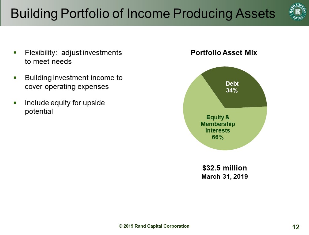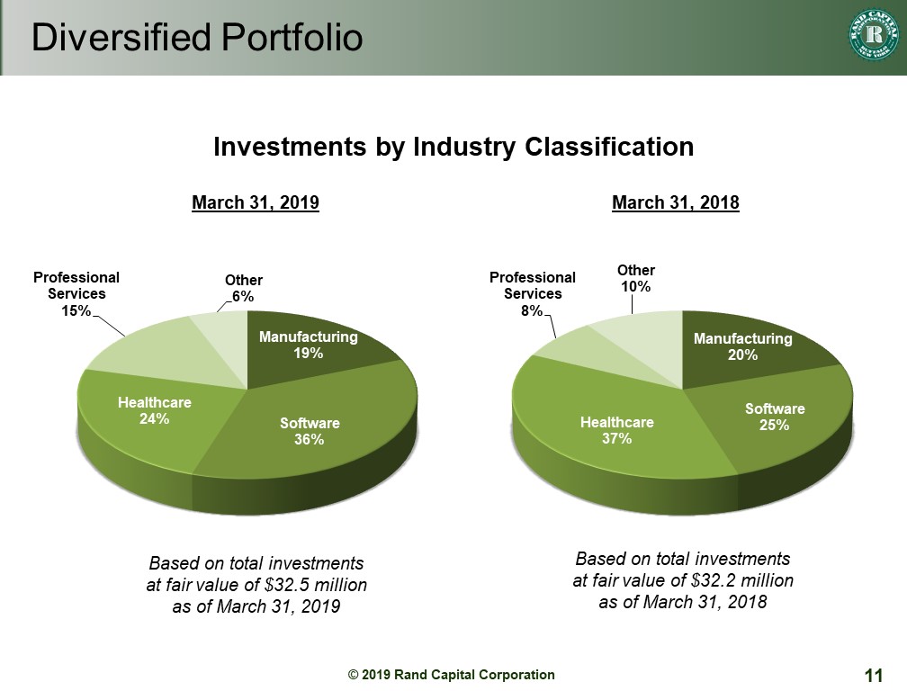 As of March 31, 2019, Rand’s portfolio consisted of 29 active companies. At that date, the portfolio was comprised of approximately 66% in equity investments and 34% in debt investments, compared with 60% in equity investments and 40% in debt investments at March 31, 2018.