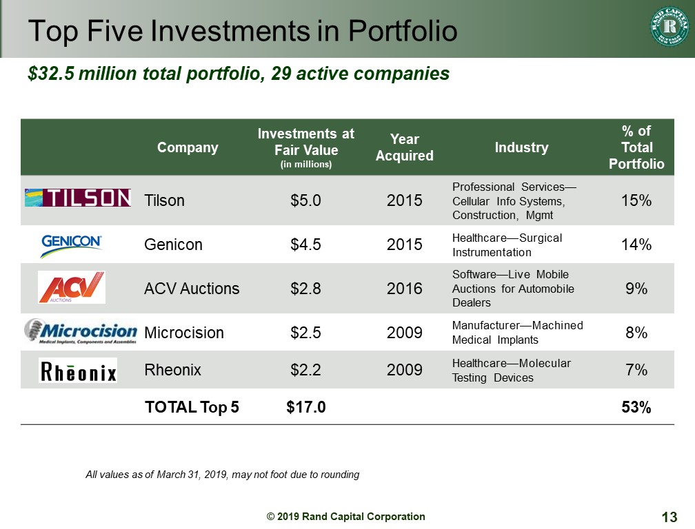 Slide 13 is a snapshot of the top five investments in our portfolio based on values at the end of March. Our portfolio was valued at nearly $32.5 million and includes 29 active companies. Since we last reported, eHealth is no longer part of the portfolio with the repayment of their loan, Tilson is elevated to the top with our recent investment and Rheonix moves back into the top five.