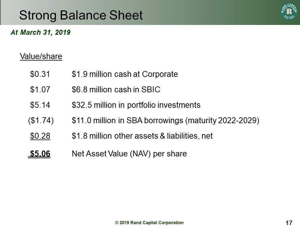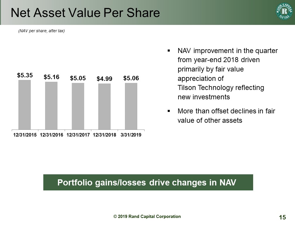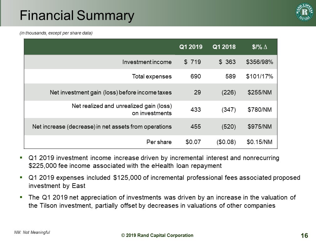 | ● | Reported $5.06 net asset value (NAV) per share at March 31, 2019, compared with $4.99 at December 31, 2018. The increase was primarily due to net appreciation in portfolio investments, mostly related to Rand’s investment in Tilson Technology Management, Inc. |